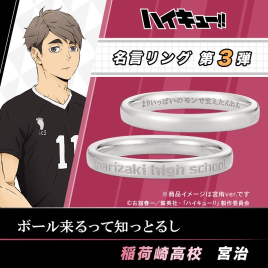 『稲荷崎高校(Inarizaki high school)』の校名をデザインしたリングの内側に、印象的なエピソードがよみがえる各キャラクターの名言を刻みました。