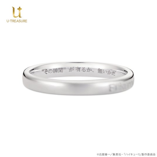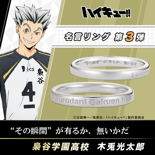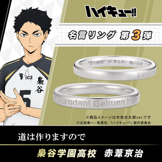 『梟谷学園高校(Fukurodani Gakuen high school)』の校名をデザインしたリングの内側に、印象的なエピソードがよみがえる各キャラクターの名言を刻みました。