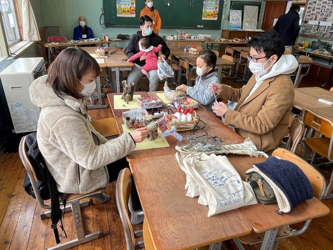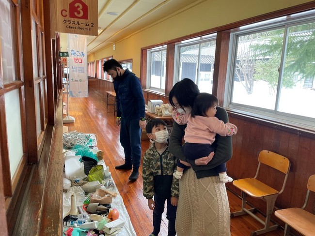 教室内に展示した海洋ごみを熱心に観察する参加者からは、自分たちの住む身近な海岸には生活ごみから見慣れない漁具、外国語の容器など多種多様なプラスチックごみにより、海が汚れていることを知るきっかけとなった様子が伺えました。普段触れる事がない多種多様な海洋ごみを材料に試行錯誤しながら楽しく創作する海ごみアートを親子で体験して、海洋ごみ削減について理解を深めることができたのではないでしょうか。