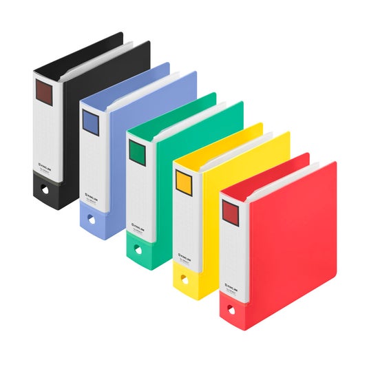 「リングファイル」をモチーフにした、キングミニオリジナルデザインのカードサイズのリングファイルです。全5色展開で色ごとに分類することができます。ポケットリフィルが10枚付属しており、別売りのポケットを追加すると最大約30枚までセットが可能です。背見出し紙の裏面は書き込み可能なシステム見出しになっており、4mm方眼のガイドがあるので、「テプラ」のラベルを貼って分類することもできます。