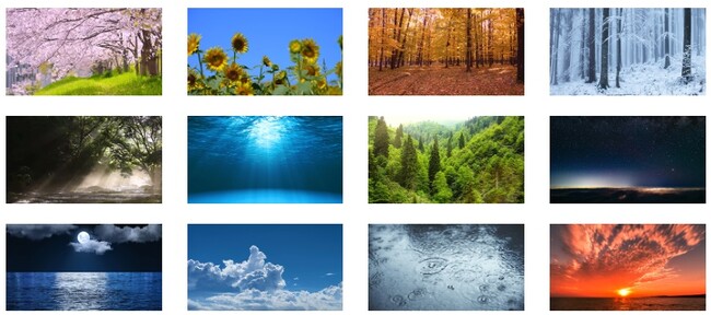 選べる背景映像テーマ:12種類(桜並木で、夏空の下で、紅葉の中で、雪景色で、水辺で、海の中で、森林の中で、星空の下で、月を眺めて、空の上で、ある雨の日に、夕焼けの前で)