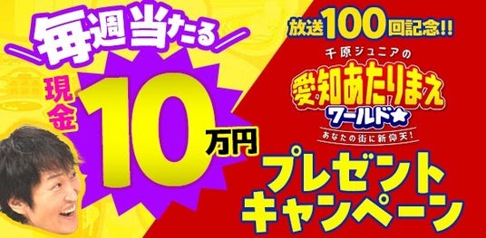『千原ジュニアの愛知あたりまえワールド☆~あなたの街に新仰天!~』はおかげさまで2025年2月15日に放送100回を迎えます。これを記念して、2025年1月11日(土)から6週にわたって、毎週現金10万円が当たるプレゼントキャンペーンを開催!応募は番組放送中に流れる電話番号へかけるだけ!番組とともにお楽しみください♪