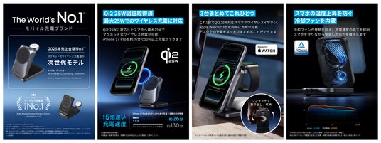 - 人気製品の次世代モデル:2025年にワイヤレス充電器カテゴリで国内売上金額No.1(※ 2025年1月~12月における外部調査会社のデータをもとにした全国有力家電量販店の販売実績集計 / 大手ECプラットフォームのランキングをもとにした自社調べ)を達成した3-in-1ワイヤレス充電器「Anker MagGo Wireless Charging Station(Foldable 3-in-1)」の次世代モデルです。