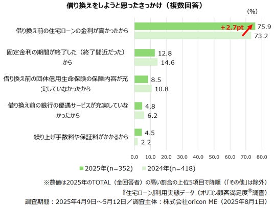 借り換えのきっかけ「借り換え前の住宅ローンの金利が高かったから」が約8割 前回より2.7pt増