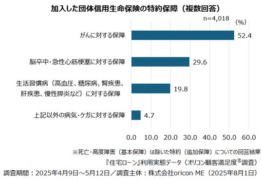 『加入した団体信用生命保険の特約保障(複数回答)』について聴取したところ、「がんに対する保障」が52.4%と最も多い結果となりました。
