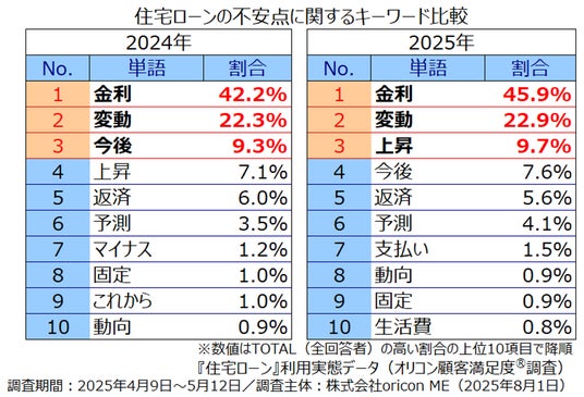 また、「住宅ローンの不安点」について自由回答で聴取したコメントのキーワード上位10項目においても、「金利」が45.9%で最多となり、前年(42.2%)と比較して3.7pt上昇しました。「変動」(22.9%)や「上昇」(9.7%)といったキーワードも上位に入り、金利変動に対する不安が昨年より高まっていることがうかがえます。