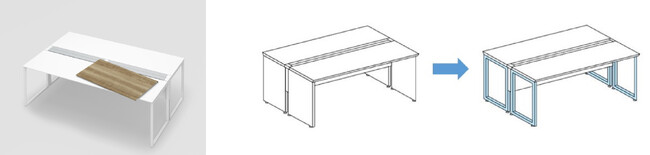 導入後も、天板カバーや脚などのパーツ変更が可能です。 既存の「WorkVista」シリーズと互換性があり、「WorkVistaLight」のユニットを追加してスタンダードなテーブルをカジュアルにアップデートすることができます。
