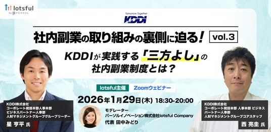 「はたらいて、笑おう。」をビジョンに掲げるパーソルグループのパーソルイノベーション株式会社 lotsful Company(本社:東京都港区、lotsful Company代表:田中 みどり)が運営する副業人材マッチングサービス『lotsful(ロッツフル)』( https://lotsful.jp/ )は、2026年1月29日(木)に「社内副業の取り組みの裏側に迫る!vol.3 KDDIが実践する『三方よし』の社内副業制度とは?」をテーマにオンラインセミナーを開催いたします。