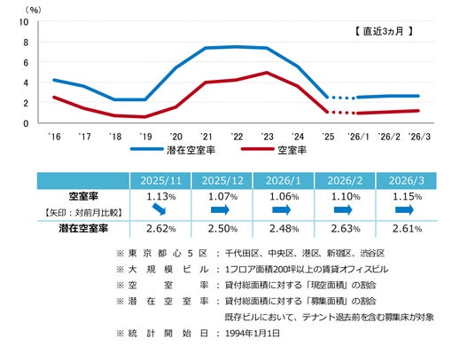 空室率は前月比プラス0.05ポイントの1.15%となった。2ヵ月連続で小幅に上昇したが、1%台前半の低水準で推移している。複数の新築ビルが空室を抱えて竣工した一方、港区の新築・築浅ビルを中心に集約移転や館内増床等でまとまった面積の空室消化が進んだ。潜在空室率は前月比マイナス0.02ポイントの2.61%となり、前月からほぼ横ばいだった。