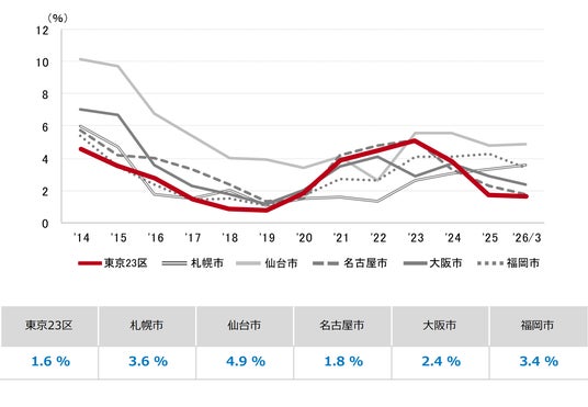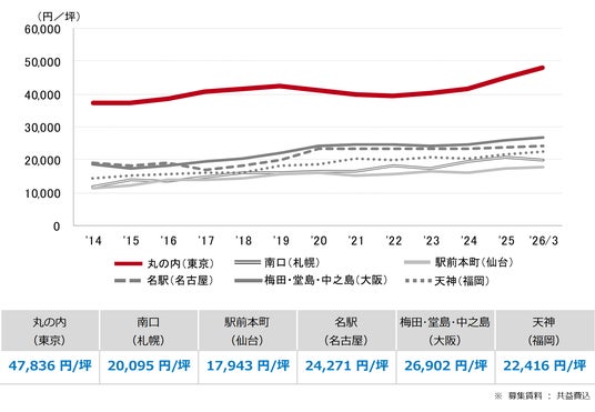 三幸エステート株式会社(本社:東京都中央区、取締役社長:福島正二郎)は、2026年3月度の東京都心5区(千代田区、中央区、港区、新宿区、渋谷区)および全国6大都市(東京、札幌、仙台、名古屋、大阪、福岡)の大規模ビル※1のマーケットデータをまとめた「オフィスマーケット2026年4月号」を公表します。
