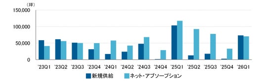 ネット・アブソープション(吸収需要)はオフィス需要の指標であり、一定期間におけるテナント入居面積(稼働面積)の増減を表す。直近2026年第1四半期は供給が需要を上回り、10期ぶりで供給過剰となった。ただし、需給ギャップはわずかであり、吸収需要は約7万坪の高水準にあることから、需要は旺盛な状況が続いている。