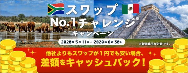 「スワップNo.1チャレンジキャンペーン」は、FX取引で日々付与されるスワップポイント(金利)を実質業界最高水準の金額で提供するキャンペーンです。対象通貨は、高金利通貨として個人投資家に人気のある南アフリカランド/円、メキシコペソ/円の2通貨ペアとなります。