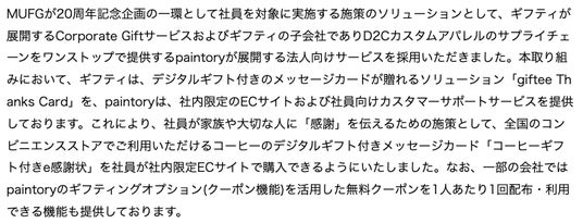 BtoE領域で、株式会社三菱UFJフィナンシャル・グループ(本社:東京都千代田区/代表執行役社長 グループCEO:亀澤 宏規、以下MUFG)が20周年記念企画の一環として社員を対象に実施する施策のソリューションとして、ギフティが展開するCorporate Giftサービスおよびギフティの子会社でありD2Cカスタムアパレルのサプライチェーンをワンストップで提供する株式会社paintory(本社:岡山県津山市/代表取締役:片山 裕太、以下paintory(ペイントリー))が展開する法人向けサービスを採用いただきました。これにより、社員が家族や大切な人に「感謝」を伝えるための施策として、全国のコンビニエンスストアでご利用いただけるコーヒーのデジタルギフト付きメッセージカード「コーヒーギフト付きe感謝状」を社内限定ECサイトで販売・配布できるようにいたしました。