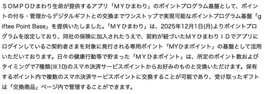 第4四半期は、SOMPOひまわり生命保険株式会社(本社:東京都千代田区/代表取締役社長:久米 康樹/以下、SOMPOひまわり生命)が提供するアプリ「MYひまわり」のポイントプログラム「MYひまポイント」の基盤として、ポイントの付与・管理からデジタルギフトとの交換までワンストップで実現可能なポイントプログラム基盤「giftee Point Base」を採用いただきました。貯まった「MYひまポイント」は、保有ポイント内で複数のスマホ決済サービスポイントに交換することができます。