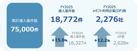 eギフトプラットフォーム事業(※1)を展開する株式会社ギフティ(本社:東京都品川区/代表取締役:太田 睦、鈴木 達哉/以下、ギフティ)は、2026年2月13日(金)に2025年12月期通期決算を開示し、デジタルギフトの高い需要の継続により、法人および自治体向けサービス「giftee for Business」(※2)における案件数・導入企業(以下、DP)数ともに四半期最高値を更新し、売上高・案件数・DP数ともに、前年同期を大きく上回る結果となったことを発表しました。また、「giftee for Business」は、2016年のサービス開始以来、サービス対象をBtoCに加え、BtoE、BtoB、GtoCに拡げるとともに、ギフトを贈る用途の開拓、ギフトコンテンツの拡充を背景に、堅調に案件数を伸ばしており、導入案件数が累計75,000件(2025年12月31日(水)時点)を突破いたしましたので、あわせてお知らせいたします。