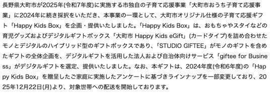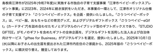 また、自治体独自に実施する子育て支援・応援事業においても導入が進みました。島根県江津市が2025年(令和7年度)に実施する市独自の子育て支援事業「江津市ベイビーボックスプレゼント事業」では、2023年、2024年に続き採択をいただき、本事業の一環として、江津市オリジナル仕様の子育て支援ギフト「ごうつベイビーボックス」を企画・提供いたしました。さらに、長野県大町市が2025年(令和7年度)に実施する市独自の子育て応援事業「大町市おうち子育て応援事業」においても、2024年に続き採択をいただき、本事業の一環として、大町市オリジナル仕様の子育て応援ギフト「Happy Kids Box」を企画・提供いたしました。両事業において、ギフトプランニングのプロフェッショナルチーム「STUDIO GIFTEE(スタジオ ギフティ)」がモノのギフトを含めたギフトの全体企画を、「giftee for Business」がデジタルギフトを選定し、モノとデジタルを組み合わせたハイブリッド型のギフトボックスを提供しております。