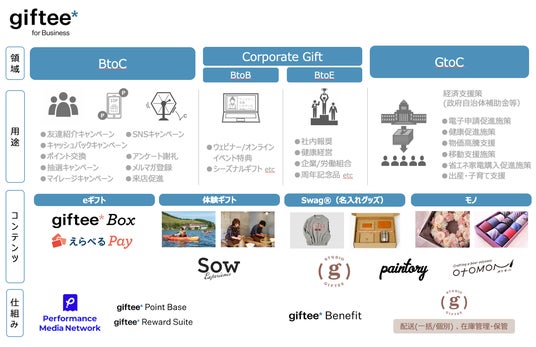 2022年12月からサービス提供を開始したGtoC(Government to Consumer)領域では、出産・子育て支援やマイナンバーカード普及促進、省エネ家電買い替え促進など、各自治体が実施する住民施策として「giftee Box(R)」や「えらべるPay(R)」、自治体オリジナルの「Swag(R)」を採択いただくケースが増えています。「giftee Box(R)」は全国チェーンの実店舗はもちろんECで利用可能なギフトも豊富にラインナップすることが可能であるため汎用性が高く、一定のテーマにあわせたギフトを自治体毎に設定可能です。そのため、子育て支援をはじめとする各種住民支援の給付など、対象者や実施目的を絞った特定施策のインセンティブに最適であり、導入も手軽なことから施策の運用もスムーズに実現できます。