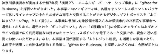 なお、神奈川県横浜市が実施する令和7年度「横浜グリーンエネルギーパートナーシップ事業」に「giftee for Business」を採択いただきました。ギフティは、各種キャッシュレスポイントをパッケージ化しラインナップの中からお好きな商品と交換することができるデジタルギフトボックスを「よこはまグリーンPay」として提供し、本事業に参加し対象設備を導入された横浜市内のご家庭や事業者へ還元しております。本事業は国が認証する「J-クレジット制度」(※8)を活用した事業であり、本制度を活用して自治体が実施する施策に「giftee for Business」を採用いただくのは、今回が初となります。