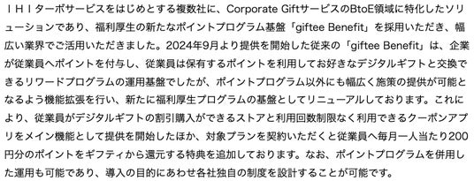 第4四半期は、Corporate GiftサービスのBtoE領域に特化したソリューションであり、福利厚生の新たなポイントプログラム基盤として2024年9月より提供を開始した「giftee Benefit」の機能を拡張し、ポイントプログラム以外にも幅広く施策の提供が可能な福利厚生プログラムの基盤としてリニューアルし、提供を開始したことをお知らせいたしました。これにより、従業員がデジタルギフトの割引購入ができるストアと利用回数制限なく利用できるクーポンアプリをメイン機能として提供を開始したほか、対象プランを契約いただくと従業員へ毎月一人当たり200円分のポイントをギフティから還元する特典を追加しております。リニューアルした「giftee Benefit」は、株式会社IHIターボサービス(本社:神奈川県横浜市/代表取締役社長 小泉 政男/以下、IHIターボサービス)など、複数社に採用いただき、幅広い業界でご活用いただいております。