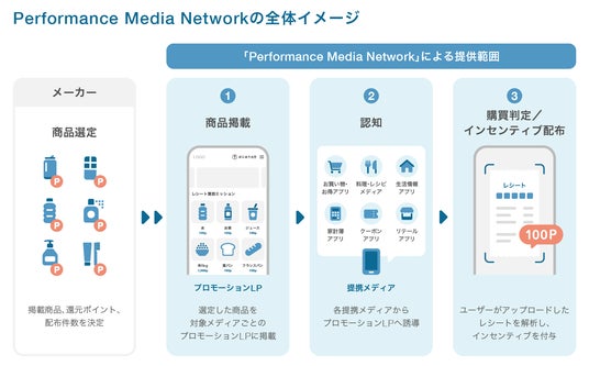 BtoC領域における新たなソリューションとして、「告知」と「購買成果」に特化したメーカーの販促施策を実現するプロモーションプラットフォーム「Performance Media Network」(以下、「PMN」)の提供を、2025年12月1日(月)より開始いたしました。メーカーは、「PMN」の活用により、複数の生活者向けアプリとの連携のもと施策の告知を横断的に実施でき、また、AI-OCR(Optical Character Recognition)によるAI解析を活用した購買保証型のプロモーションの実現が可能となります。プロモーションに参加した生活者は、各アプリ内のバナーから遷移し、対象商品の購入レシートをアップロードすることで、AI解析による購買判定後にアプリの専用ポイントや「えらべるPay(R)」を獲得することができます。