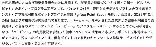 さらに、株式会社大和総研(本社:東京都江東区/代表取締役社長:望月 篤/以下、大和総研)が、法人および健康保険組合向けに展開する、従業員の健康づくりを支援する新サービス「ハービット」のポイントプログラム基盤として「giftee Point Base」を採用いただきました。「ハービット」の導入企業および健康保険組合の従業員は、ご自身のスマートフォンにインストールした「ハービット」アプリの利用状況や参加した健康イベントでの成果等に応じてポイントを取得することができ、保有ポイント内で複数のキャッシュレス決済サービスポイントやデジタルギフトに交換することが可能です。