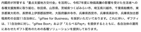 第4四半期は、内閣府が所管する「物価高騰対応重点支援地方創生臨時交付金(以下、重点支援地方交付金)」(※6)を活用し、令和7年度に物価高騰の影響を受けた生活者への各種支援施策に取り組む、秋田県、山形県、茨城県つくばみらい市、埼玉県川越市、千葉県船橋市、東京都東大和市、長野県上伊那郡辰野町、大阪府藤井寺市、兵庫県西宮市、兵庫県高砂市、兵庫県加古郡稲美町の全国11自治体(※7)に採択いただきました。これに伴い、ギフティは、11自治体に対し、「giftee for Business」の主力プロダクト「giftee Box(R)」および「えらべるPay(R)」を提供するとともに、各自治体の運用にあわせたギフト配布のための各種ソリューションを提供いたしました。
