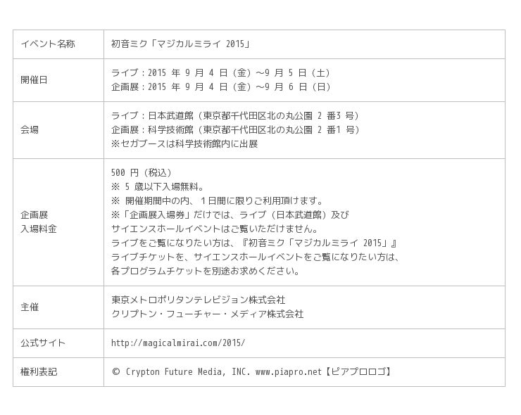 株式会社セガゲームス コンシューマ・オンライン カンパニーは、2015 年 9 月 4 日(金)から 9 月 6 日(日)まで、日本武道館及び科学技術館にて開催される『初音ミク「マジカルミライ 2015」』(東京メトロポリタンテレビジョン株式会社 / クリプトン・フューチャー・メディア株式会社 主催)に出展いたします。