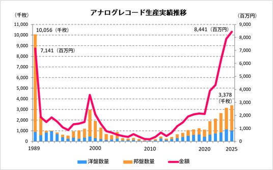 オーディオレコードでは、コロナ禍以前の2019年以来6年ぶりの1,500億円超え、そのうちアナログレコードは数量・金額ともに5年連続のプラス成長を記録し、金額では1988年以来37年ぶりの80億円超えと好調傾向が続いています。