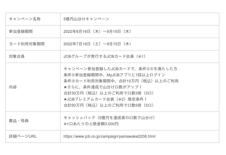 株式会社ジェーシービー (本社:東京都港区、代表取締役会長兼執行役員社長:浜川 一郎、以下:JCB)は、2022年6月16日よりJCBグループ会員(※1)を対象に、条件達成者の口数に応じて総額5億円をキャッシュバックする「5億円山分けキャンペーン」を開始します。