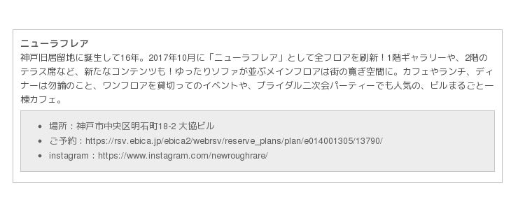 場所:ニューラフレア / 〒650-0037 兵庫県神戸市中央区明石町18−2 大協ビル 2階テラス