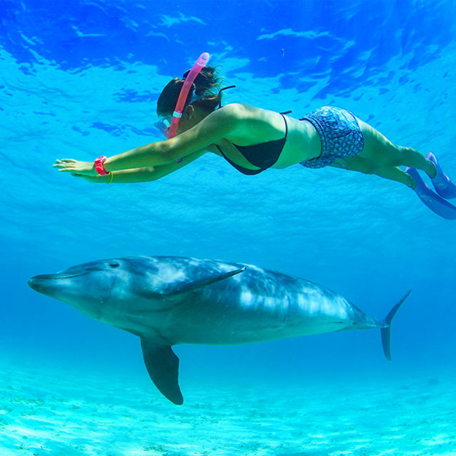 イルカをはじめとした海の生き物を中心に、動物たちを「観る」のではなく「学ぶ」ことを重視したプログラムで、ラグーン内でトレーナーと一緒にイルカとふれあったり、ビーチ沖合の広い外洋でイルカと一緒に泳いだり、ここでしか体験できないプログラムをご用意しております。