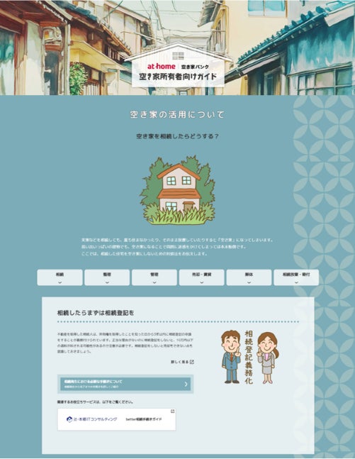アットホームでは、「空き家所有者向けガイド」のさらなる充実を図り、空き家所有者が空き家を放置することなく、能動的に管理・利活用ができるよう、幅広い分野の情報を提供し、積極的な活用をサポートしてまいります。