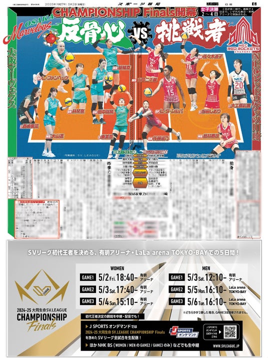 報知新聞社(代表取締役社長・依田裕彦)が発行する5月2日付スポーツ報知では同日から開催されるバレーボール「大同生命SVリーグCHAMPIONSHIP Finals」を男女ともに大特集。2日に初戦を迎える女子(有明アリーナ)は大阪マーヴェラスとNECレッドロケッツ川崎、3日に初戦の男子(有明アリーナ)はサントリーサンバーズ大阪とジェイテクトSTINGS愛知が対戦。リーグの初代王者を決める大一番に出場するチームの紹介、見どころを掲載しています。