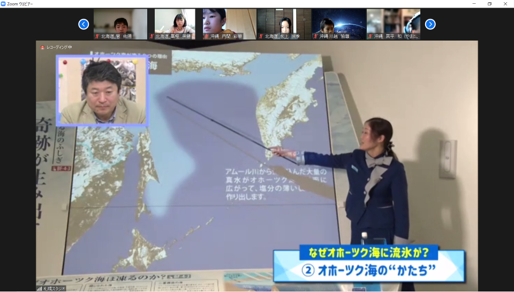 第2回の沖縄でのサンゴの海の調査に続く今回は、北海道のオホーツク海にやってくる流氷の観測や氷の下のアイスアルジーについて、現地からの映像と解説、時にはクイズを交えながら調査。流氷の形成メカニズムや亜寒帯域に生息する生物について学んだほか、流氷はなぜオホーツク海にやってくるのか、海の豊かさと流氷は関係があるのかなどを、オホーツク流氷館の方からの解説や現地の映像を通して解き明かし、海を未来へつなぐためのアクションを考えました。