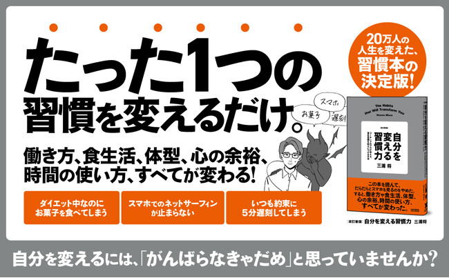 元本『自分を変える習慣力』は、9年前の刊行以来、多くの方に支持され、20万部超のベストセラーになりました。今回の改訂リニューアルに伴い、第8章「デジタル社会をすこやかに生きる習慣力」を新たに収録。昨今、深刻な問題となっているスマホ依存や、リモートワークの普及による働く環境の変化に悩むビジネスパーソンに向けて、現状を打破するよい習慣の身につけ方を新たに書き下ろしました。
