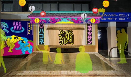 そこで、年々増加する欧米をはじめとする外国人旅行者の方にさらなる“日本らしさ”をお届けし、滞在中の思い出を作っていただく為、“シン”要素として、日本を象徴するポップカルチャーの世界観を、提灯や、富士山、LEDネオンライト等の装飾で表現しました。従来の酒風呂の魅力を残しつつ、さらに現代風かつポップでクールなエンターテイメント性の高いお風呂へと“シン“化いたします。