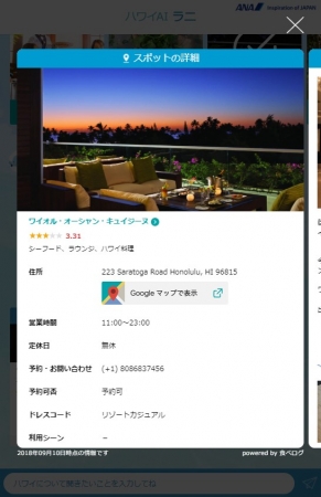 食べログは2018年4月より、ANAの国内線「ANA Wi-Fi Service」に飲食店情報などを提供しています。このたび新たに、ANAがハワイの観光情報や航空券・ツアー予約等サービスを提供する「ANA HAWAii #hawaii24」のAI(人工知能)会話サービス「ハワイAIラニ」へ、食べログが有するハワイの飲食店情報2,000件超を提供開始します。