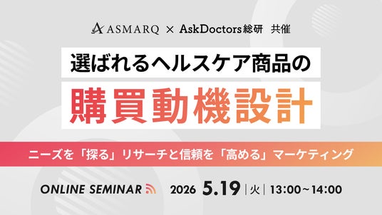 株式会社アスマーク(東京都渋谷区東、代表取締役:町田正一)は、2026年5月19日(火)13:00に、 医療従事者向けプラットフォームを運営するエムスリー株式会社(東京都港区:代表取締役 谷村格)と、「ヘルスケア商品の購買動機設計」をテーマに共催セミナーを開催いたします。