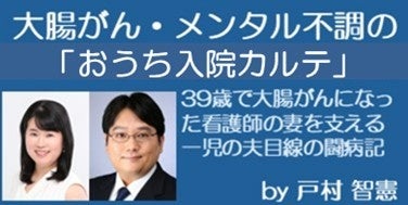 弊社理事長の戸村智憲が開設の「おうち入院カルテ」に詳細がございますが、戸村が、妻の大腸がん・がんのショックによる急性精神病性障害での精神科入院と術後・退院後の自宅療養において、育児(現在、息子は小6でもうすぐ中1)・家事・炊事・洗濯をはじめ、妻への時に6時間ぶっつづけで寄り添った「お話しカウンセリング」などを通じ、医師ではなくとも病院の声掛けやカウンセリングよりも遠慮なくもっと寄り添える家庭・夫をめざして、「おうち入院」の「院長」として、妻の寛解へ向けた歩みを寄り添って全面サポートして参りました。