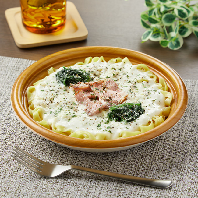 【内容】オリジナルの生パスタに合わせ、クリームソースにチーズを加えることで、チーズのコクとクリームソースの味を感じられるように仕立てました。さらに「旨み」を感じられるように「白みそ」を入れた奥深い味わいの商品です。