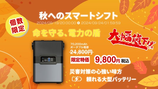 楽天市場「Show !t」は、本日20:00開催の楽天お買い物マラソンスに参加します。緊急時や災害時はもちろん、アウトドアやキャンプ、電動キックボードの充電にも最適なポータブル電源を、この機会にぜひお求めください!