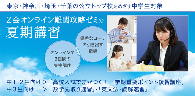 株式会社増進会ホールディングス(Z会グループ)のグループ会社である株式会社Z会は、「Z会の通信教育」中学生向けコースにおいて「オンライン難関攻略ゼミ夏期講習」を開講します。東京都・神奈川県・埼玉県・千葉県の公立トップ高校をめざす中1生・中2生・中3生を対象とした夏期講習を8月1日(月)より随時開講します(2022年6月15日(水)申込受付開始)。3日間の少人数・双方向授業で、ハイレベルな仲間と切磋琢磨しながら、短期間で集中的に力を伸ばします。
