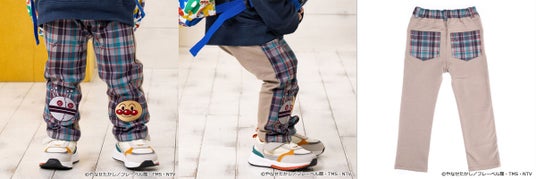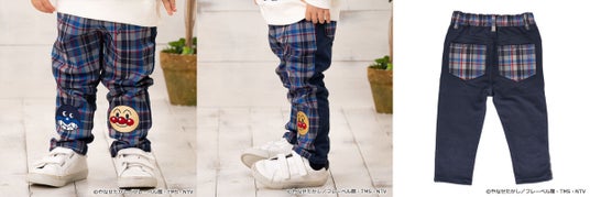 ベージュはブラウン系のチェックにアンパンマンとだだんだん、ネイビーはブルー系のチェックにアンパンマンとばいきんまんのアップリケが施されています。フロントはチェック柄、バックはシンプルな無地を使用しており、前後で違う表情が楽しめます。