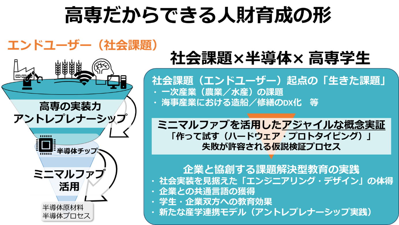 高専機構が蓄積してきた半導体教育のノウハウや実験設備の活用例、産学官金連携の事例を集約し全国へ波及させる中核拠点として佐世保高専が機能することで、組織的・戦略的に推進できる体制へと進化します。