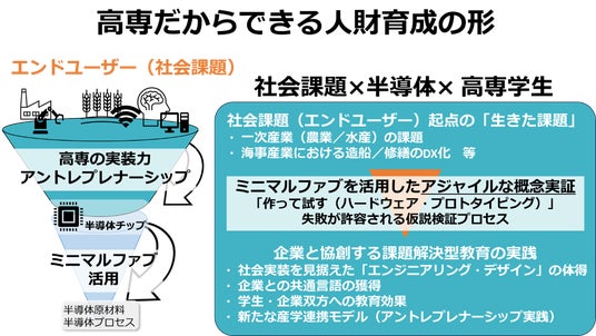 半導体産業が直面する深刻な人材不足(経産省試算:2030年までに約3.5万人不足)に対し、全国高専のネットワークを通じた体系的な教育により、現場の課題を即座に解決できる高度なエンジニアを継続的に輩出します。特にS-PORTでは、ミニマルファブ(※)を活用して製造プロセス全体を俯瞰する「つくる」技術と、AIやロボット等への社会実装を見据えてデバイスを「つかう」実践知を統合することで、単一工程に特化した分業型人材ではない、全体最適を考えられる真の即戦力を育成します。