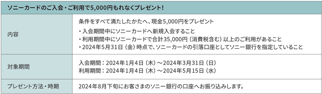 ソニー銀行株式会社(代表取締役社長:南 啓二/本社:東京都千代田区/以下 ソニー銀行)は、2024年1月4日(木)より、ソニーのオフィシャルクレジットカードであるソニーカードについて、キャンペーンを実施しますので、お知らせいたします。