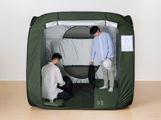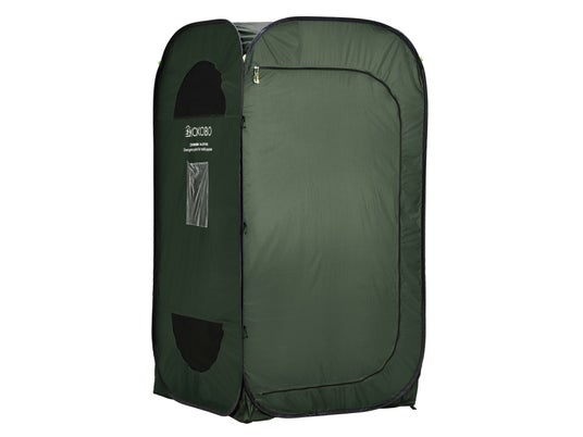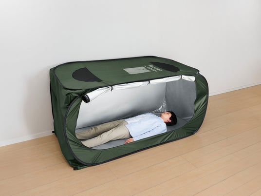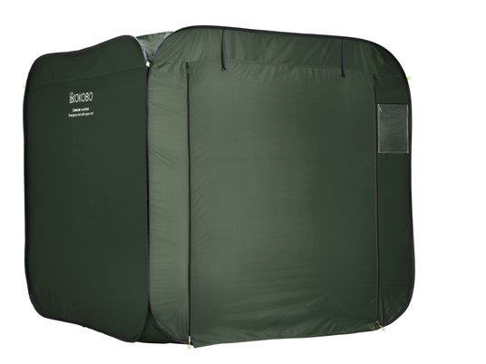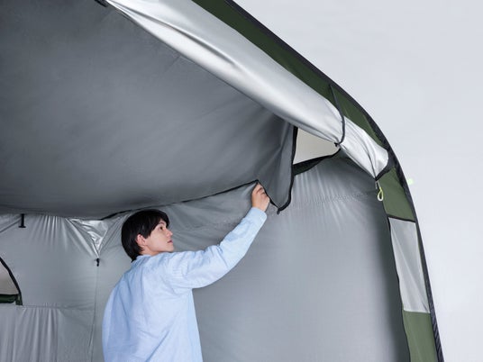 着替え時には縦置き、休息時には横置きと、用途に応じて使い分けできる1人用テント。誰でも簡単・スピーディに設営でき、収納時はコンパクトに収まります。
