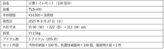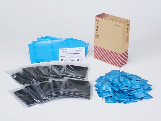 既存の「災害トイレセットII」から使用回数を増量。1人あたり1日平均5回とされるトイレ使用に対し、3日分・約6人分に相当する備蓄が可能です。課やフロア単位での備蓄にも適しており、A4ファイルサイズでロッカーや書棚にもすっきり収納できます。