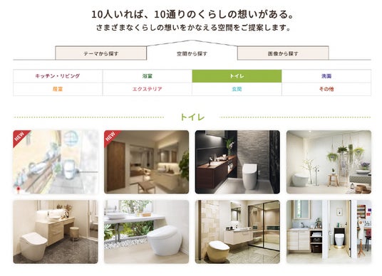 今回、これまであった「テーマから探す」の他に「空間から探す」・「画像から探す」の2種類の検索方法を追加し、お客様の検索時の利便性を向上させました。「空間から探す」では、「トイレ」「居室」「エクステリア」といった住宅の空間ごとに検索でき、「画像から探す」では、全プランをビジュアルとして一度に閲覧し、気になった画像からプランを探せます。