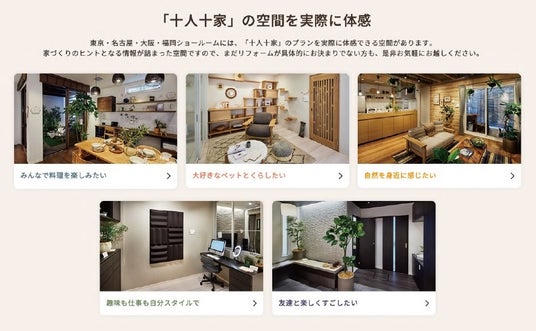 さらに、十人十家の発信強化として、十人十家サイト(https://re-model.jp/10plan/)内のプラン検索性向上や、4か所のTDYコラボレーションショールーム(※1)に設置している、空間展示「十人十家 くらしのヒント発見空間」を紹介するコンテンツの追加なども行います。